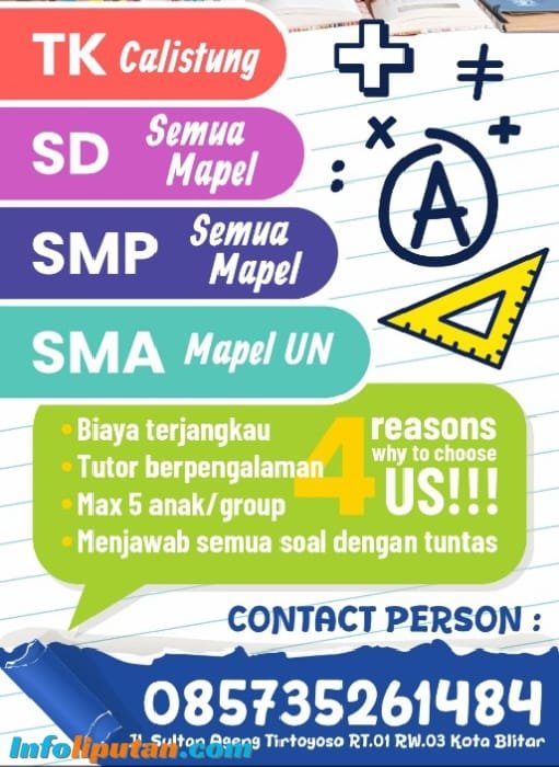 Blitar/infoliputan.com – Rintisan Bimbingan Belajar S1, penyedia layanan bimbingan privat dan reguler, kini hadir untuk membantu para siswa di berbagai jenjang pendidikan. Dengan program yang mencakup TK, SD, SMP, dan SMA, Rintisan Bimbingan Belajar S1 menawarkan solusi bimbingan terbaik untuk mendukung perkembangan akademik siswa.
