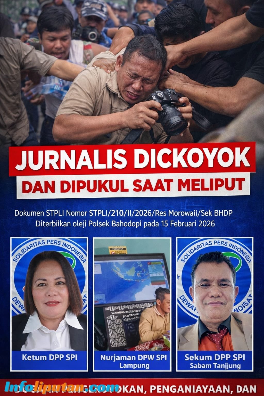 Lampung Infoliputan.com – Dewan Pimpinan Wilayah Solidaritas Pers Indonesia (DPW SPI) Lampung menyampaikan sikap resmi atas dugaan kekerasan terhadap jurnalis Tribuanamuda.com saat meliput aksi buruh di kawasan PT Indonesia Morowali Industrial Park (IMIP), Kabupaten Morowali, Sulawesi Tengah.