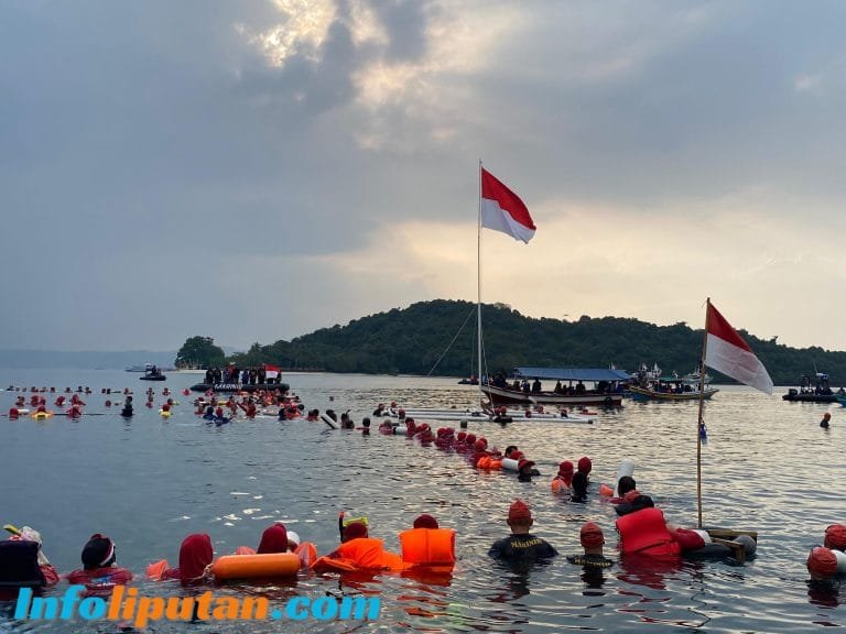 Infoliputan.com/Pesawaran – Suasana Pantai Mutun, Kabupaten Pesawaran, Lampung, pada Sabtu (16/8/2025) berubah menjadi lautan semangat merah putih. Sebanyak 565 perenang dari berbagai kalangan turun ke laut dengan membawa bendera kecil, lalu mengibarkannya secara serentak untuk memperingati HUT ke-80 Kemerdekaan Republik Indonesia.