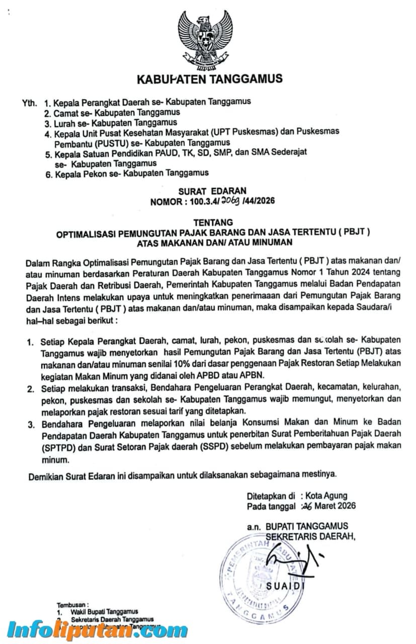 TANGGAMUS,//infoliputan .com– Pemerintah Kabupaten (Pemkab) Tanggamus resmi menerbitkan surat edaran tentang optimalisasi pemungutan Pajak Barang dan Jasa Tertentu (PBJT) atas makanan dan/atau minuman. Kebijakan ini ditujukan untuk meningkatkan pendapatan asli daerah (PAD) dari sektor pajak restoran.
