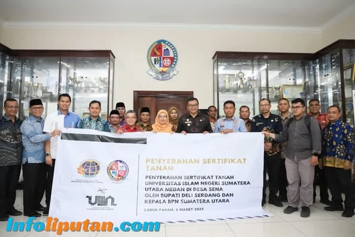 Bupati Deli Serdang, dr. H. Asri Ludin Tambunan menyerahkan Sertifikat Tanah Universitas Islam Negeri Sumatera Utara (UINSU) di Desa Sena, Kecamatan Batang Kuis dari Badan Pertanahan Nasional (BPN) kepada Rektor Universitas Islam Negeri Sumatera Utara (UINSU), Prof. Dr. Nurhayati, MAg, Kamis (06/03/2025).