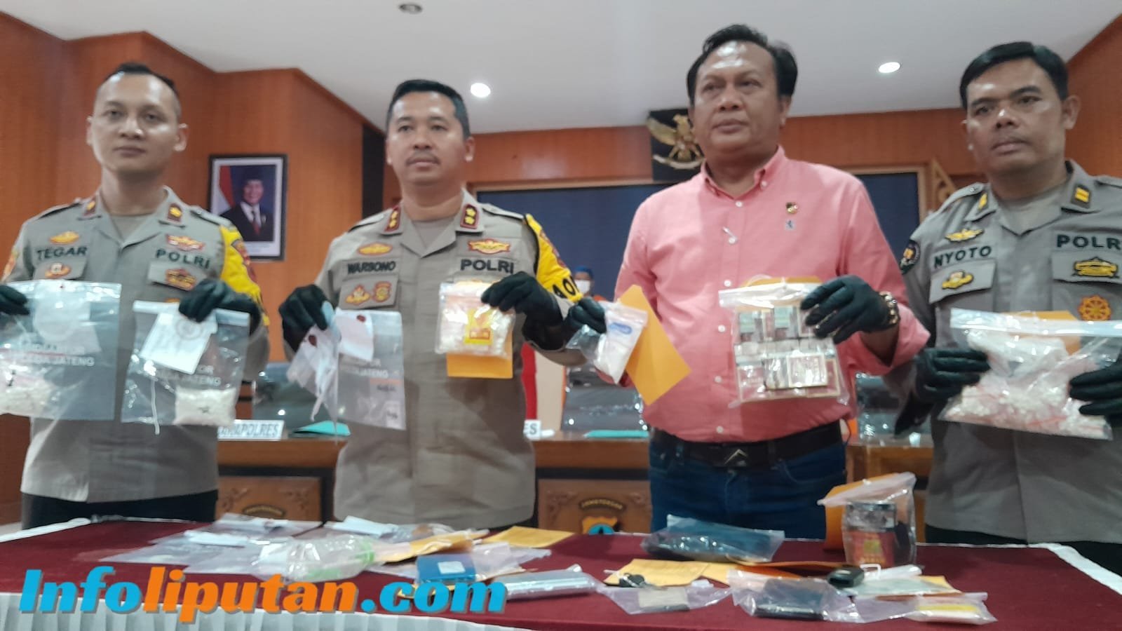 Dimana di jelaskan dalam konferensi pers bahwa ” Sejumlah barang bukti yang berhasil disita meliputi 23,25 gram sabu, 207,49 gram ganja, dan 1.586 butir pil berlogo Y, dan berhasil diamankan serta sebagian di gelar di lokasi konferensi pers di aula Polres Klaten, sebagain lagi masih di Lab guna penyelidikan lebih lanjut, ” papar Kapolres Klaten.