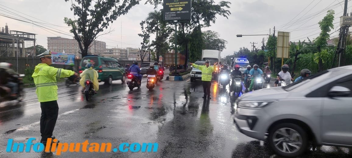 Satuan Lalu Lintas (Sat Lantas) Polresta Deli Serdang, melakukan pengaturan lalu lintas di Jalan Lintas Medan – Lubuk Pakam. Jumat (14/02/25)