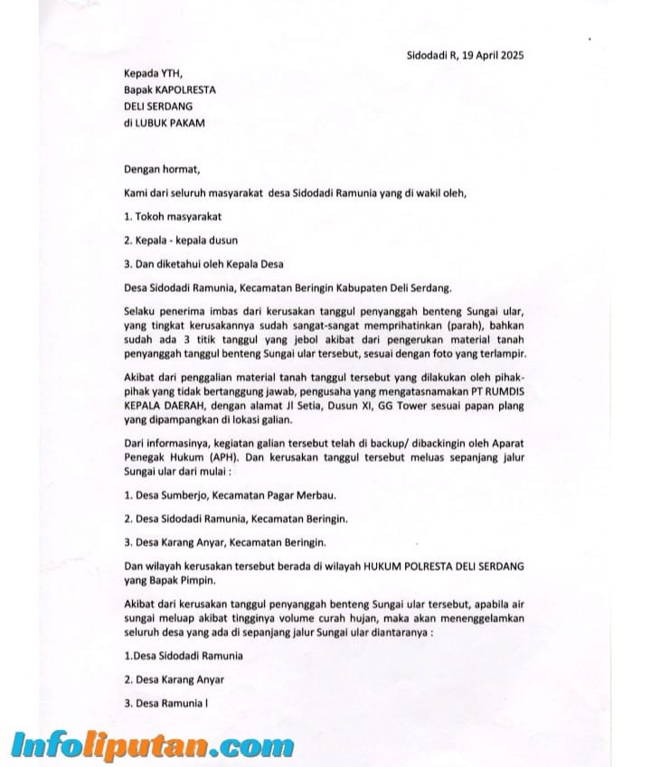 Deli Serdang, Info Liputan – Kekhawatiran warga di bantaran Sungai Ular, Deli Serdang, mencapai titik puncak. Maraknya galian C ilegal yang tak tersentuh hukum telah memicu keresahan dan ketakutan di Kecamatan Beringin, Pantai Labu, Lubuk Pakam, dan Pagar Merbau. Ancaman kerusakan tanggul dan potensi banjir bandang yang dahsyat mendorong masyarakat untuk bertindak.